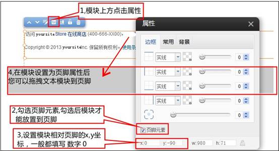 找到底部信息,一般使用文本模块,添加好模块后点击属性设置为页脚元素后就可以拖拽到底部(所有模块都可以点击属性设置为页脚元素)