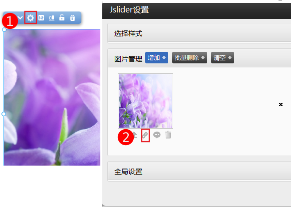 添加了jslider幻灯展示后,逐张添加图片,图片添加完,点击“图片管理”右边的“+”号打开图片管理功能,如下图: