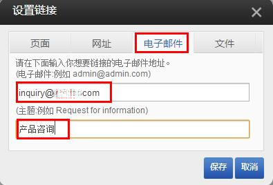 输入目标电子邮件地址和邮件的主题,点击“保存”后预览,访客点击相应的文字,只要这个访客的电脑有安装邮件本地客户端,如outlook或者foxmail,电脑系统会自动弹出一个使用outlook或者foxmail发送电邮给inquiry@021host.net的主题为“产品咨询”的邮件,访客只需要填写邮件内容即可。