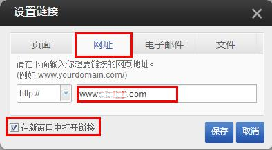 在空白处写入目标网页地址,如需在新窗口中打开这个链接,则勾选“在新窗口中打开连接”。完成后,点击“保存”后,对全局进行一次保存,即可预览效果。