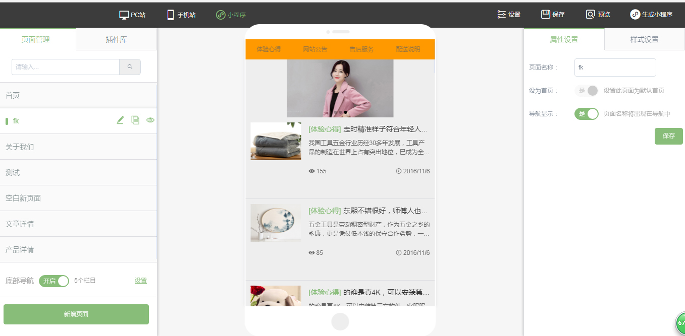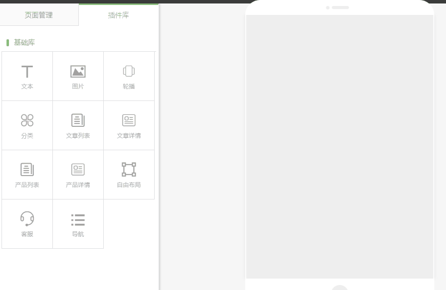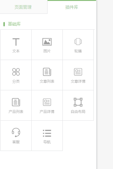 左边区域有两个tab,页面管理和插件库;中间区域是可视化编辑器区域;右边区域是对应的属性设置和样式设置