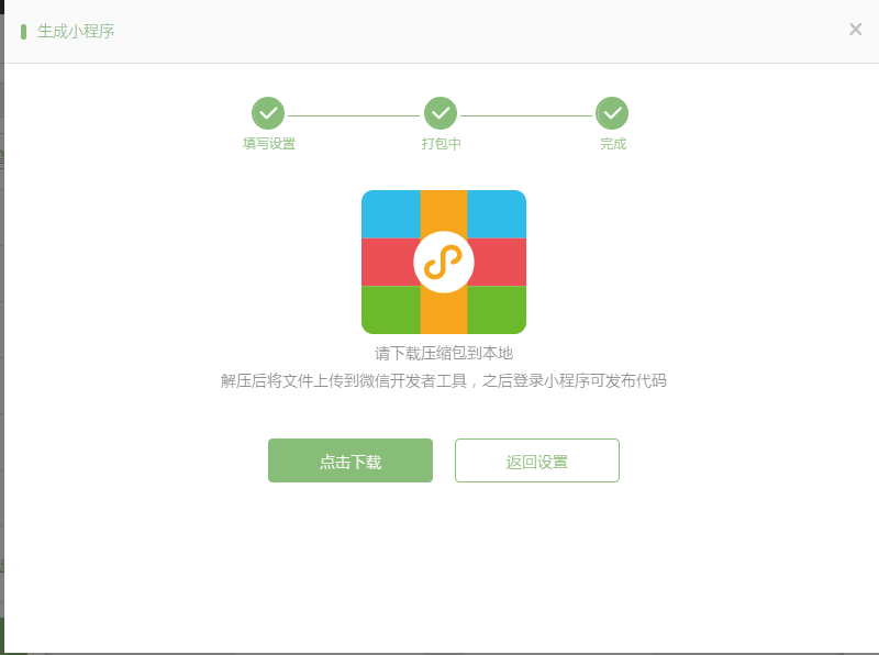 设置填写完之后,可以生成一个压缩包,解压之后上传到微信开发者工具进行发布,之后等待微信审核,审核通过后可上线