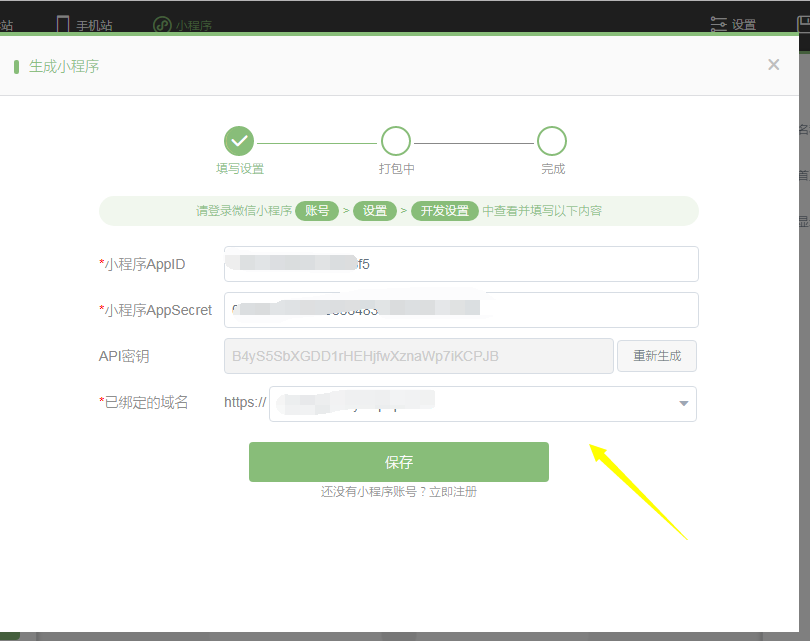 点击生成按钮,用户需要填写基本的设置项以及配备一个https开头的域名,可查看建站之新官网的帮助文档进行设置步骤