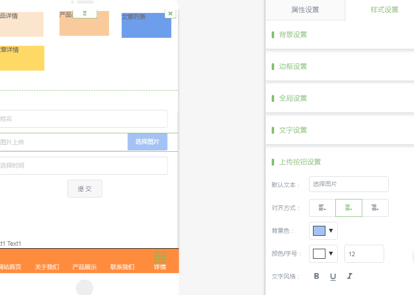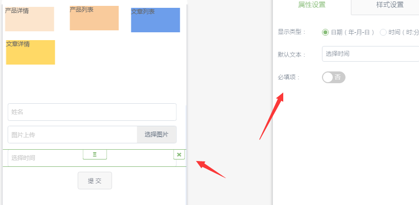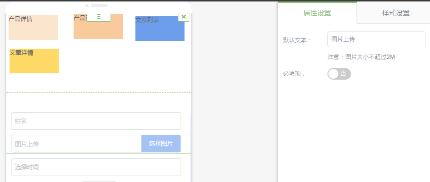 ①.点击事件---功能里增加了详情和列表页面 ②.选择产品详情,下方会出现链接到和选择数据 链接到:链接到带有产品详情插件的页面 选择数据:可以选择指定的产品 如果选择的是产品列表,下方同样出现链接和选择数据,但是需要链接到带有产品列表的页面,选择数据将会显示产品分类,用户可以选择显示指定的某些分类 文章列表和文章详情的使用方法同上,不再介绍 二.表单增加图片上传和日期选择器子组件 ①.表单子组件可以看到图片上传和日期选择器 ②.选择日期选择器,右侧属性设置可以设置日期的显示类型,有日期和时分两种选择 ③.显示如下,日期类型: 时间类型: ④.使用图片上传功能,需要配置小程序账号的合法域名,如下图,需将四个域名都配置成绑定的域名。如果设置成功了,但开发模式如报错:fail url not in domain list ,这个问题只需提交小程序发布审核通过之后就可以了。 ⑤.图片上传组件,图片的大小不能超过2m ⑥.样式设置里面,除了常规的设置,还可以设置图片上传按钮样式 ⑦.进入后台动态表单,增加了所属页面,指的是该表单组件所在的页面 ⑧.在表单详细数据页面,增加了提交时间,并且可以查看详细的表单提交内容 三.系统的一些优化 ①.基础版和标准版的分页同步了营销版的页码样式 ②.文章增加定时发布和定时下线(所有版本) A.添加文章这里,文章状态增加了定时发布和定时下线功能