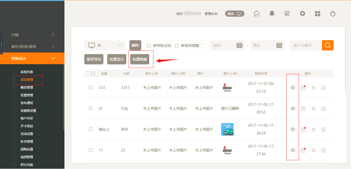 ①.后台“营销活动”中点击“留言管理”,选择需要显示的留言,点击“批量显示”即可,如图: