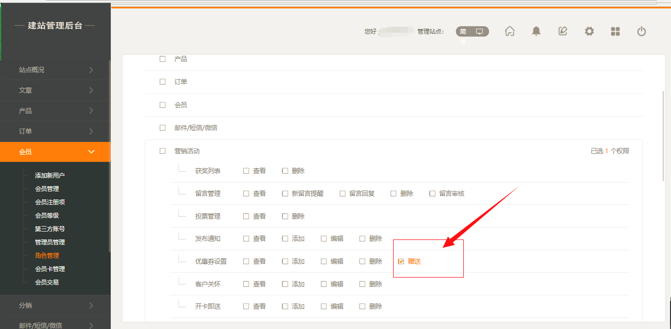 4.如果需要管理员有赠送优惠券的权限,需要在“管理员管理”-“优惠券设置”中勾选该权限,管理员才能具备该赠送权限,否则不具备该权限。