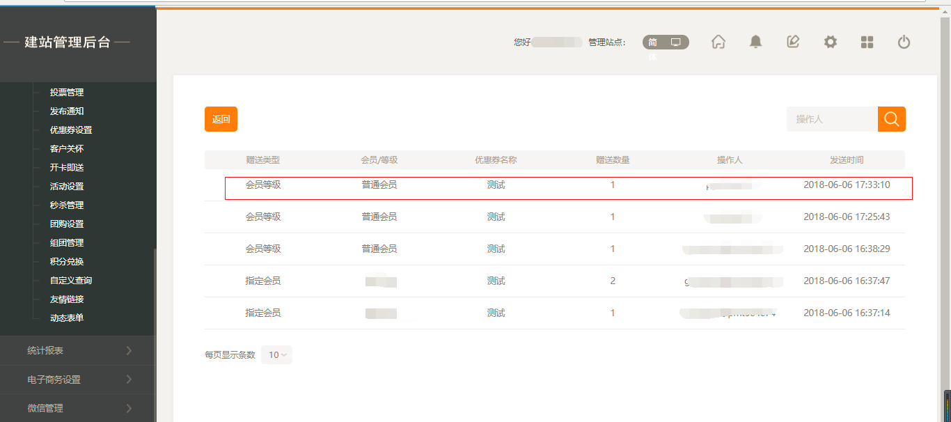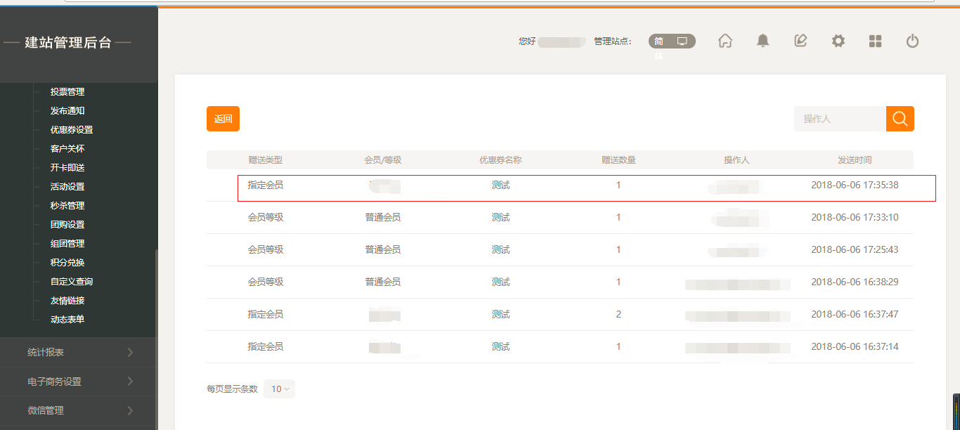 1.后台点击“营销活动”-“优惠券设置”添加优惠券,填写该优惠券的信息,“是否支持领取”点击“否”即可,添加优惠券之后,点击“确定”,会直接跳转到优惠券的列表页面,然后点击赠送优惠券,可以选择赠送类型,“会员等级”或“指定会员”(注:默认为按照“会员等级”赠送),然后选择对应的“会员等级”和“优惠券”(注:该选项支持单选或多选),选择完毕后,输入赠送的数量,如填写为“2”,则该会员等级下的每一个会员都会有2张该会员券,点击“发送优惠券”之后,会直接跳转到“赠送记录”页面,可以看到刚才赠送的优惠券记录,如图:
