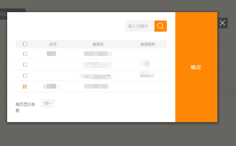 2.当点击赠送类型为“指定会员”的时候,会有一个弹出框(注,支持单选或多选;可以搜索某个会员;也可以设置每页显示的条数),如图所示: