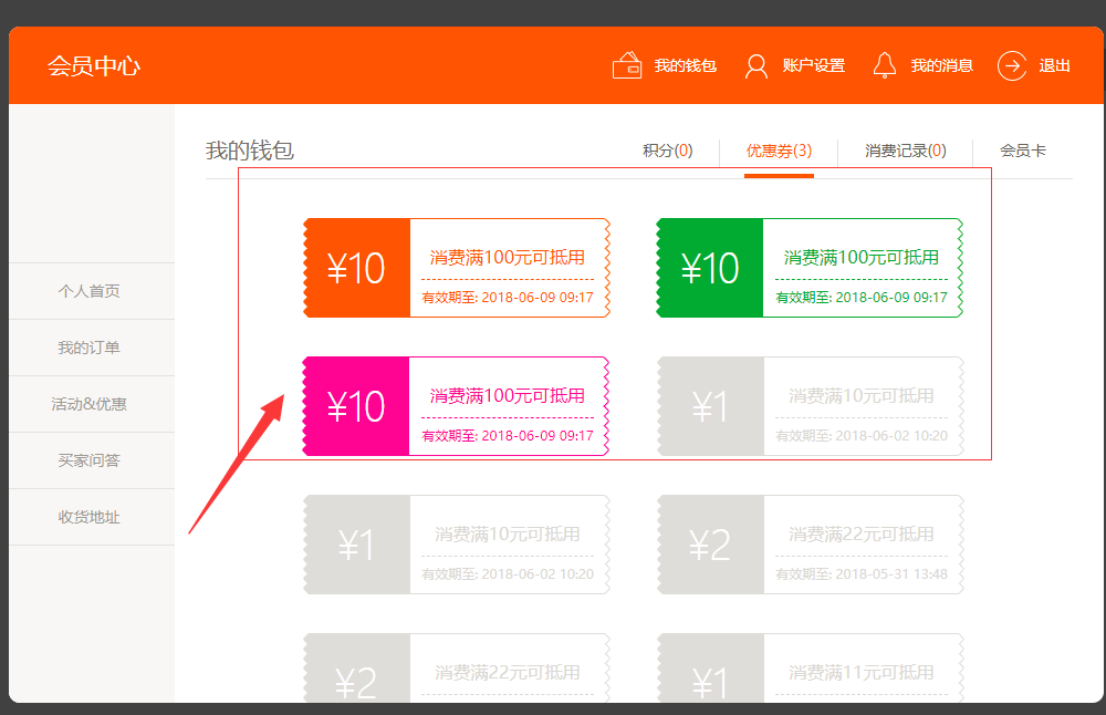 3.该会员登录后,在“用户中心”可以直接看到赠送的优惠券,如图:
