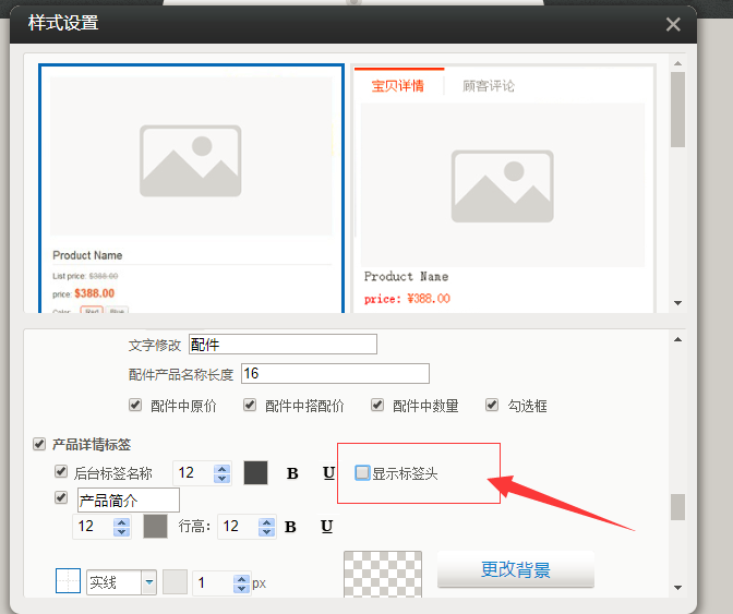 1.在“产品详情”样式设置中,“产品详情标签”新增“是否显示标签头”,选择否时,我们可以显示该标签下的内容,但是标签头隐藏,如图所示: