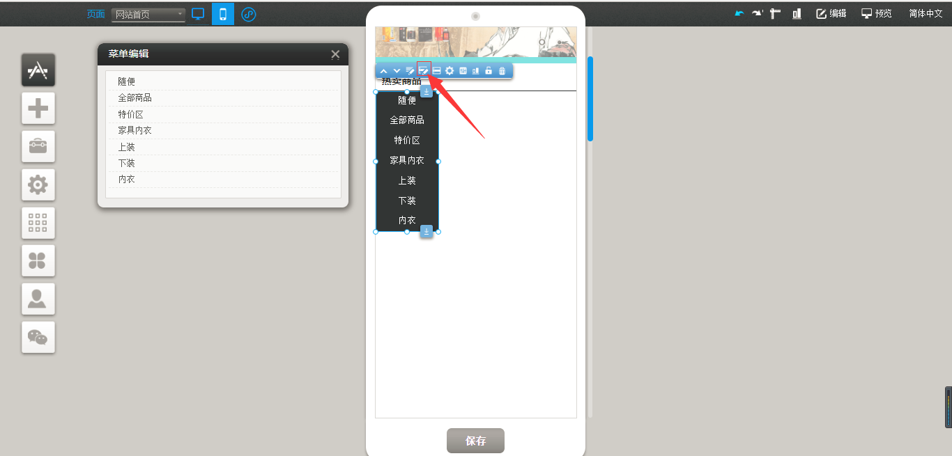 2.然后点击“菜单编辑”,在弹出框中,我们可以选择相对应的分类,进行属性设置,点击后,有八种样式选择,我们可以对该分类进行不同的样式选择,选择完成之后,点击保存即可,(注:当选择别的样式时,该标签按钮自动隐藏)如图所示:
