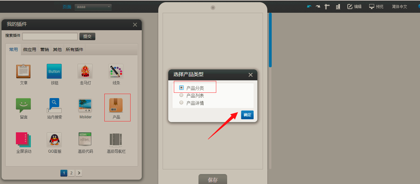 1.在编辑器中拖入“产品”插件-选择“产品分类”,点击选择“样式”设置,选择“纵向”中的第三个样式,一级分类左侧展示二级分类右侧展示,(注:在产品分类样式中,默认全部展示)如下图所示: