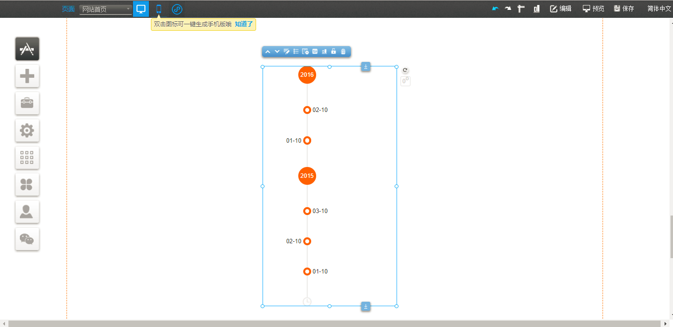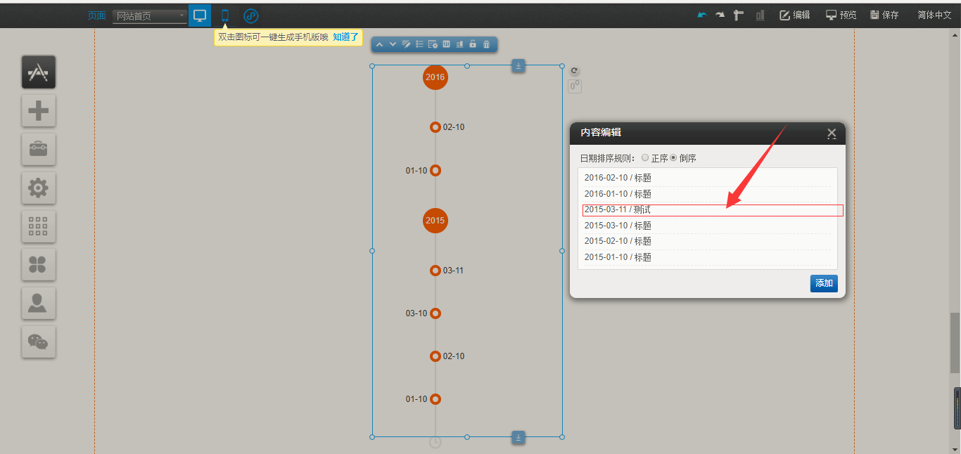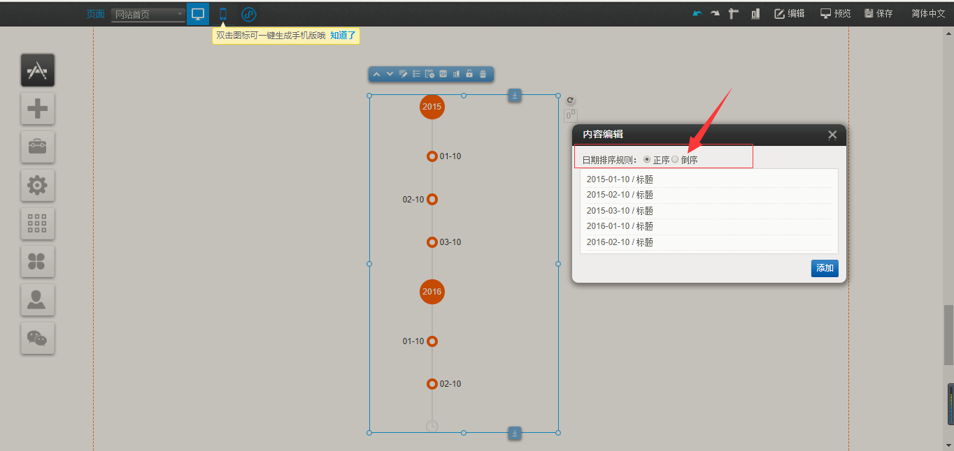 1.在编辑器中,拖入“时间轴”插件,选择样式之后,我们点击“内容编辑”,可以看到有“倒序”和“正序”两个选项,我们可以根据自己的需要,选择对应的选项,如图所示: