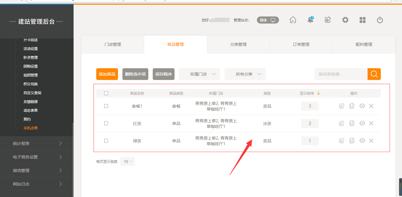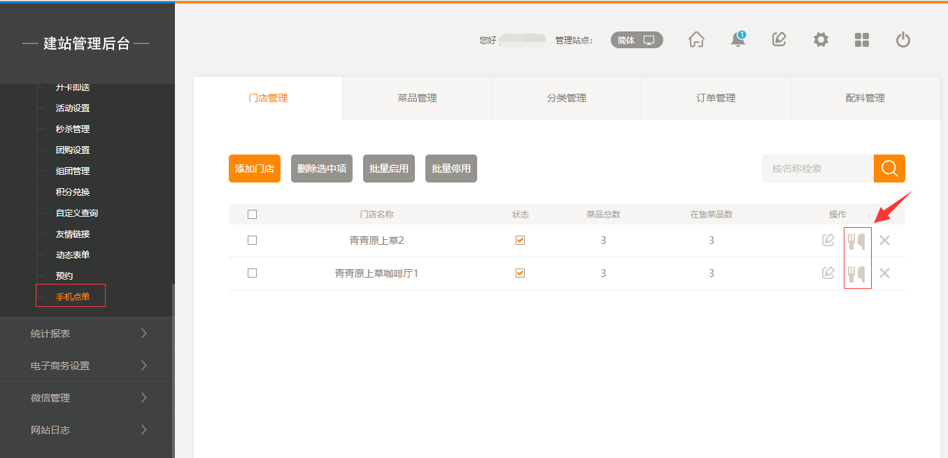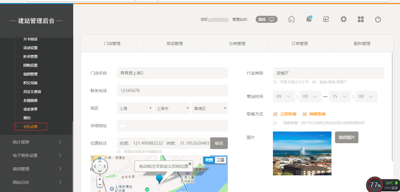 1.首先,点击“后台管理”-“手机点单”-“门店管理”-“添加门店”,填写完店面信息之后,我们点击保存即可(注:1.首先需要填写店面的地址然后可以拖动地图进行;2.店面多添加5家店面),保存之后,我们添加菜品时有两个入口,一个是店面所对应的入口,一个是在菜品管理中可以选择所属店面,如图所示:
