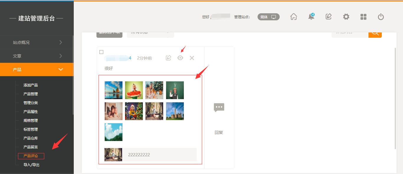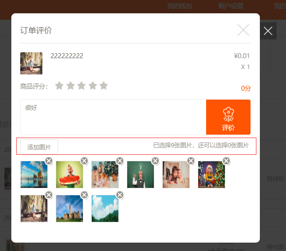1. 以pc版为例,在前端“会员中心”-“待评价”中点击需要评价的产品,在文本框的下方会有晒图功能,传入图片后点击“评价”即可(注:仅支持9张图片),在后台“产品评价”中,将该评论点击显示后,在前台中该产品评论中会显示该评论,如图所示:
