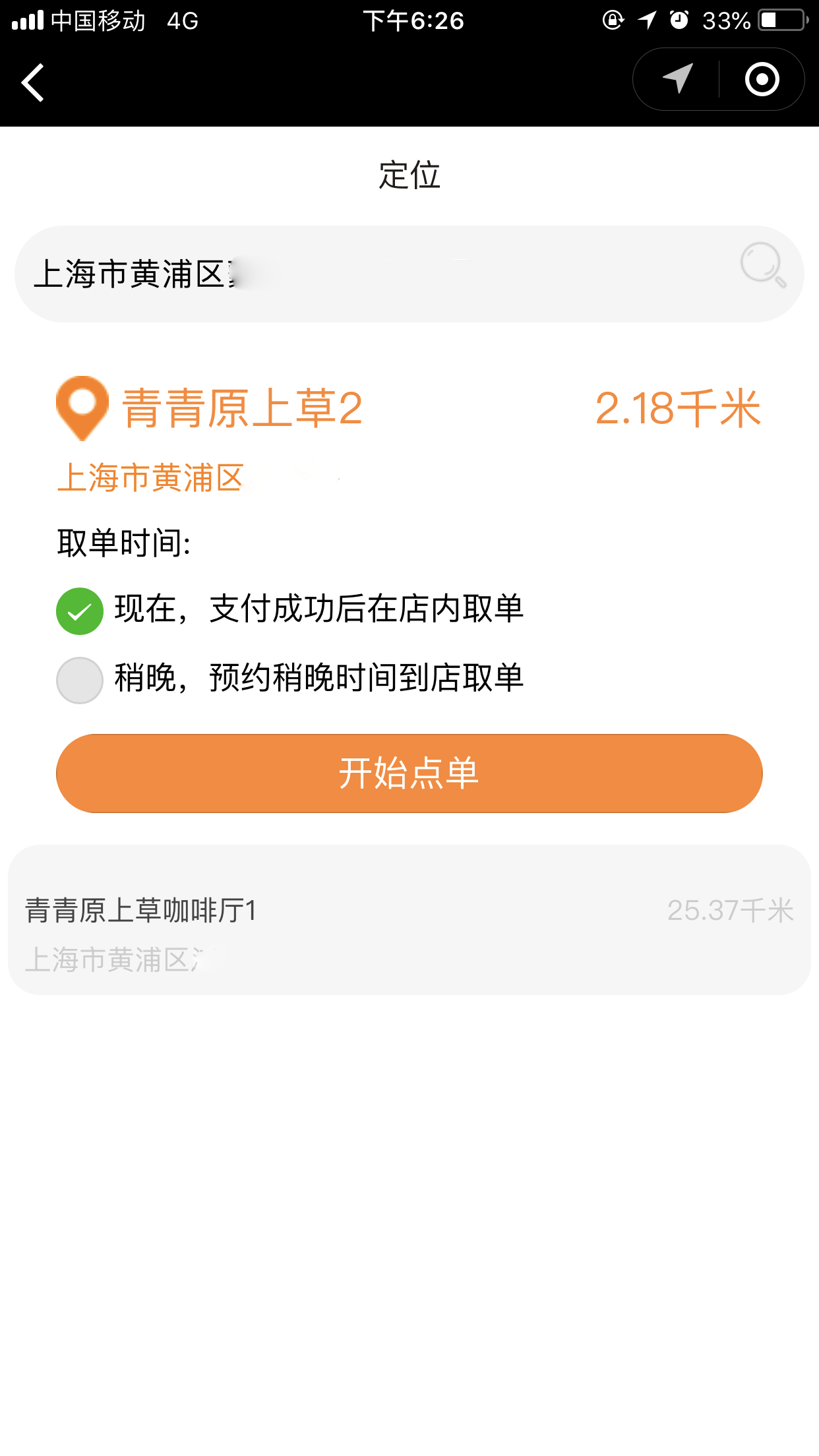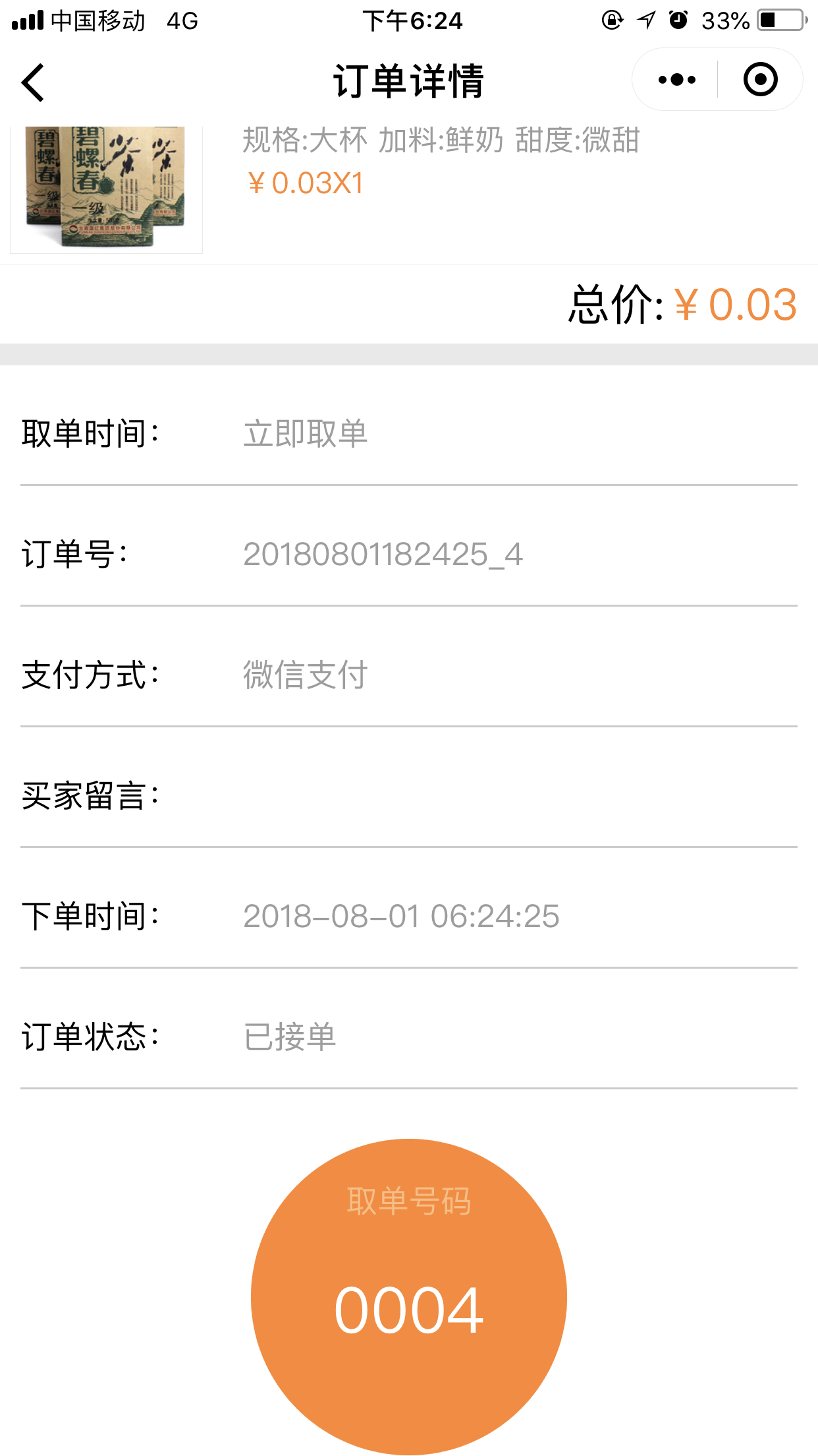 4.在前台,用户点击“开始点单”可以根据位置匹配到近的店面,并且可以选择取餐的方式“立即取餐”或“稍晚取餐”,进入点单列表页我们添加菜品时,可以选择我们在后台添加的“配料”、“口味”、以及“规格”等,选择完毕之后,点击“去结算”跳转到提交订单页面,取单时间根据用户的选择会显示为“立即取单”或者为“取单的时间点”,提交订单后,会跳转到“订单详情”页面,当商家在后台点击“接单”接单后,会有“取餐码”显示出来,如图所示: