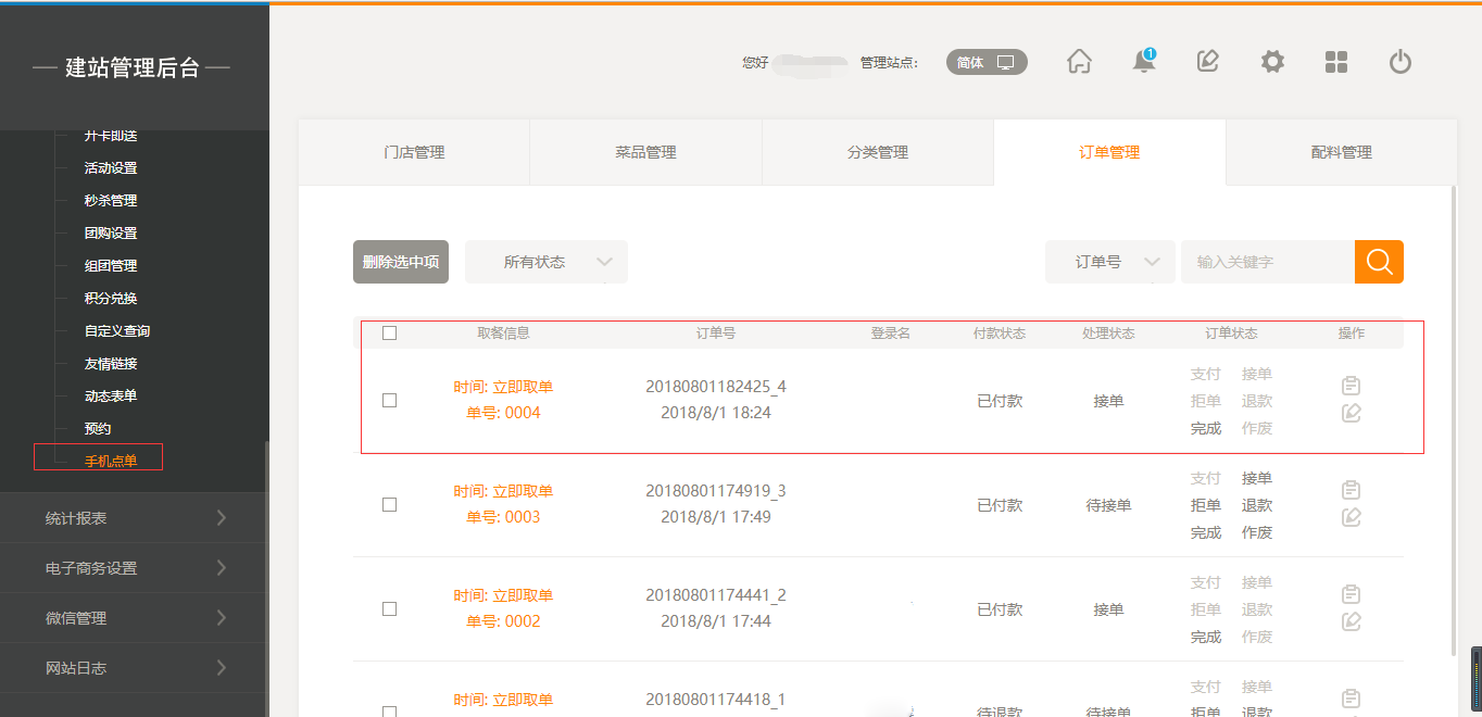 5.在“会员中心”中—“手机点单”中可以看到所有的订单详情,如图所示: