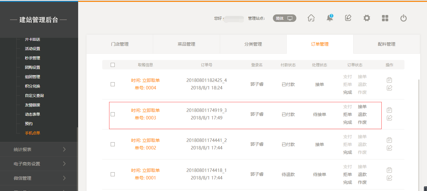 6.在后台“订单管理”中,当商家已经接单后,前台用户则不能申请“退款”,如果商家没有接单,则用户可以进行“申请退款操作”,如图所示: