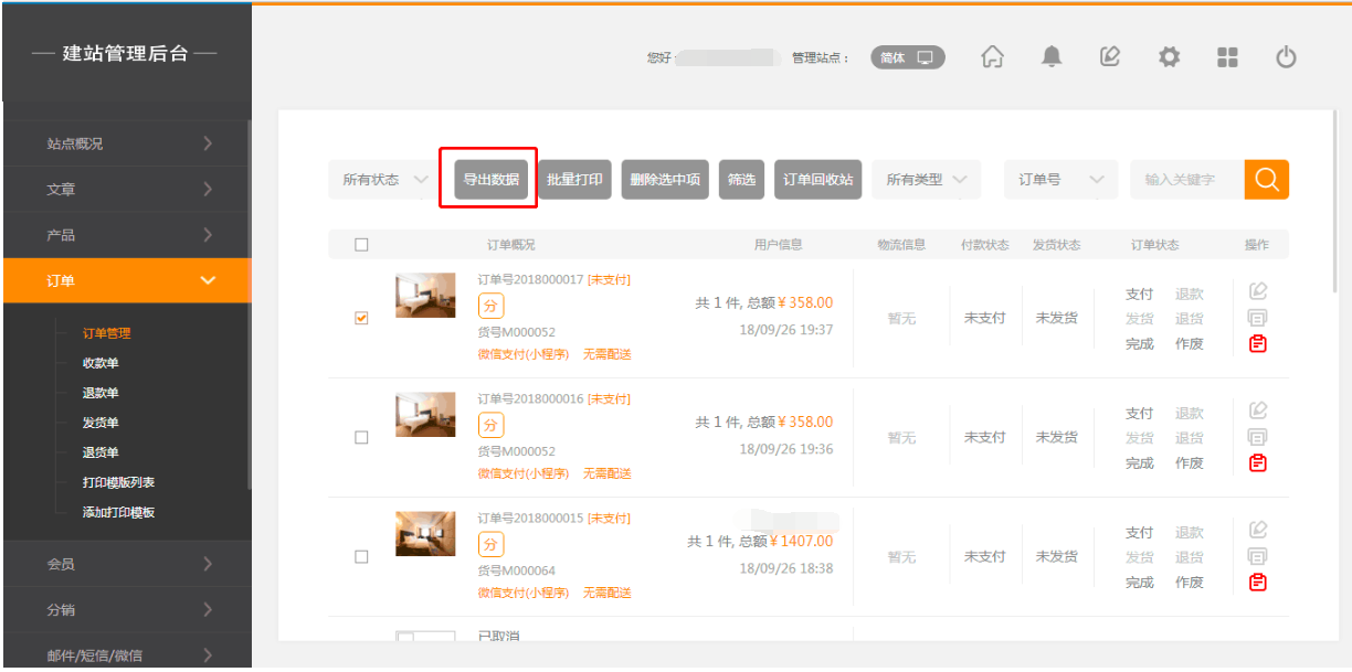 1.后台订单管理中导出数据功能支持订单备注导出,如图所示: