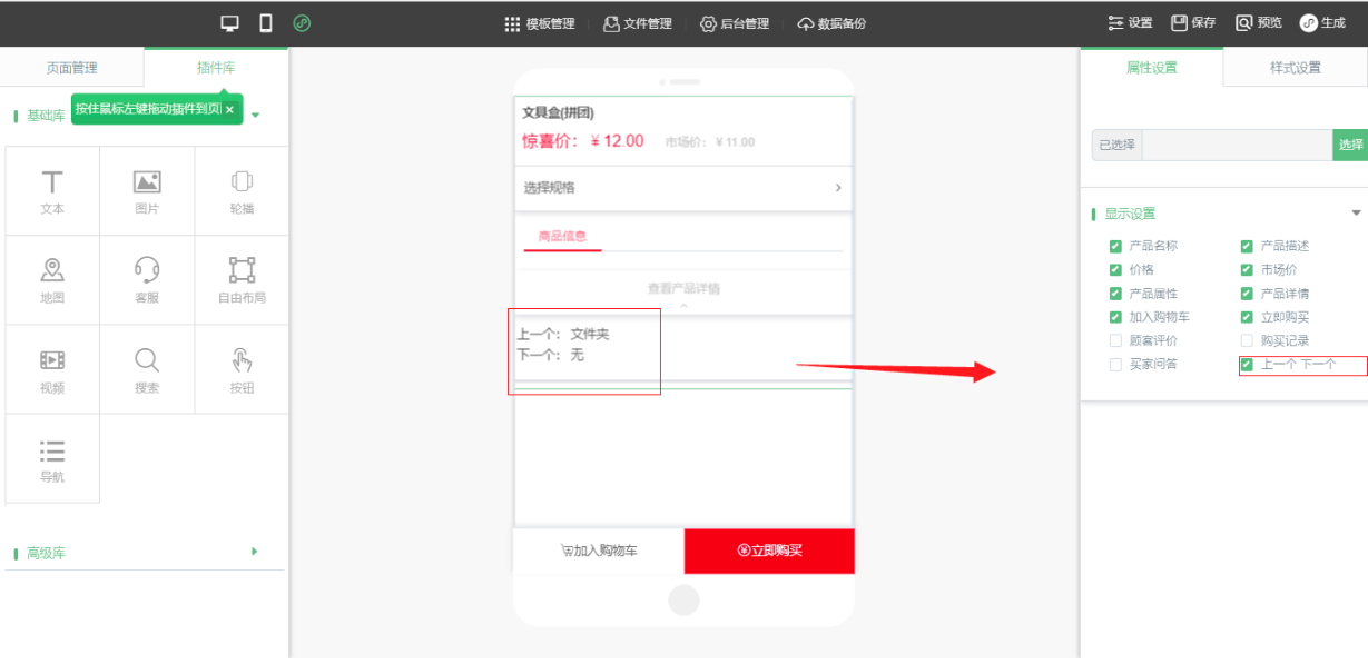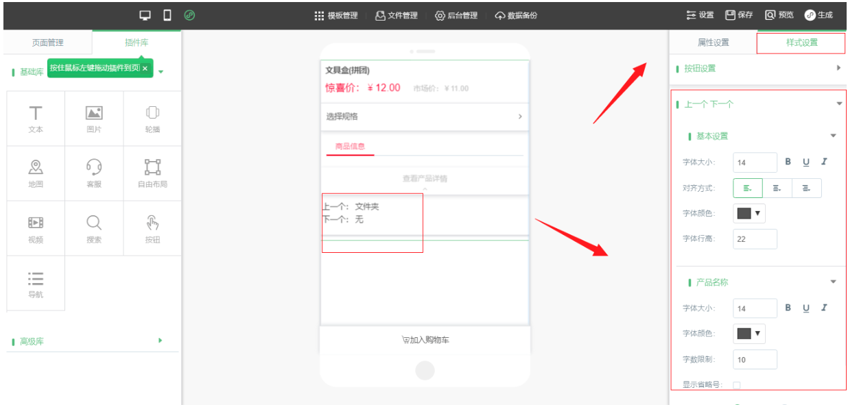 1.小程序编辑器中拖入“产品详情”,点击“属性设置”-“显示设置”中勾选“上一个、下一个”,勾选完毕后,点击“样式设置”可以给“上一个、下一个”进行设置并选择数据源的来源,如图所示: