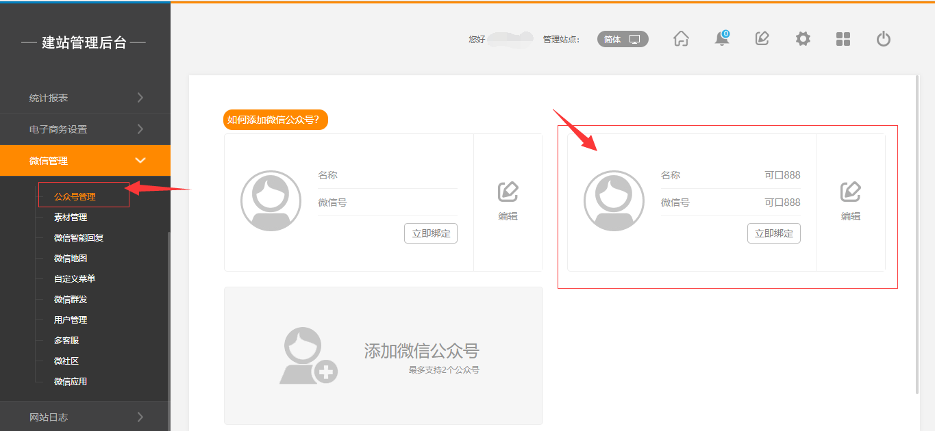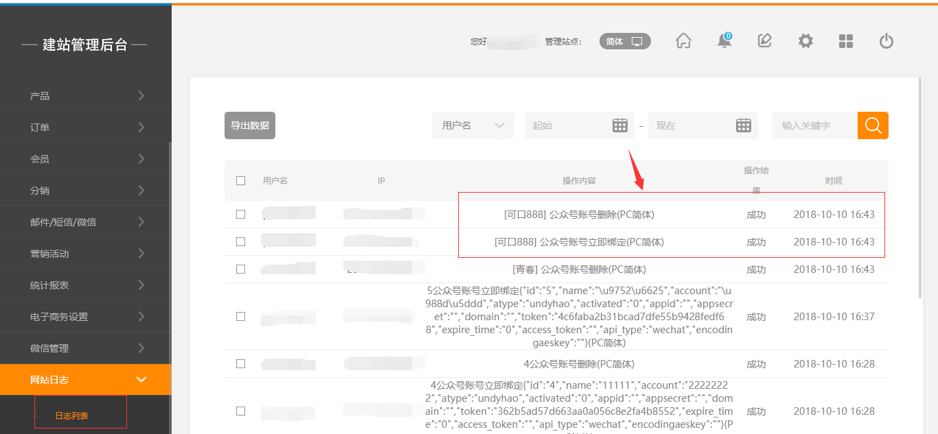 1.点击后台管理-“微信管理”-“公众号管理”,添加完成并绑定或删除该公众号后,在“网站日志”中会有相应的日志记录,如图所示:
