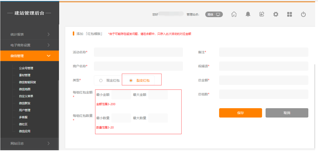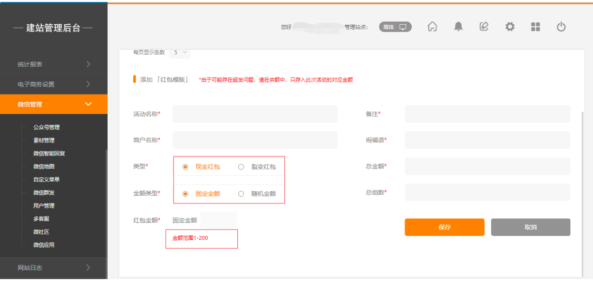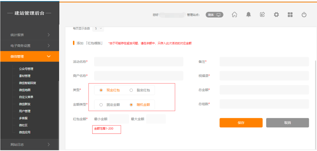 1.点击后台管理-“微信管理”-“微应用”-“微红包”-添加红包模板,点击任意红包类型,都会有相应的金额提示,如图所示: