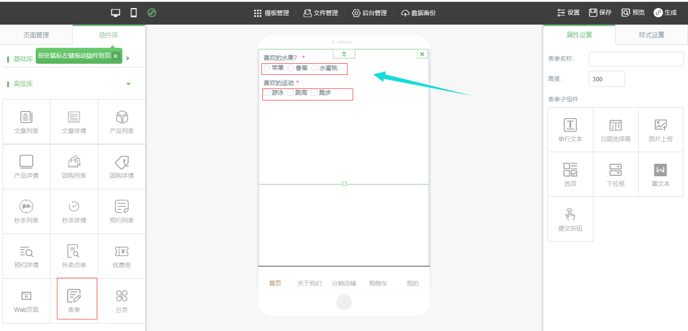 1.在小程序编辑器中拖入“表单插件”,选择“选项”样式后,填写的选项内容会在下一行显示,如图所示: