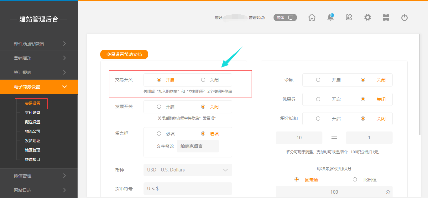 1.当小程序生成后,在建站之星后台“电子商务设置”-“交易设置”-“交易开关”重新选择关闭或开启时,不需要再次生成该小程序,如图所示: