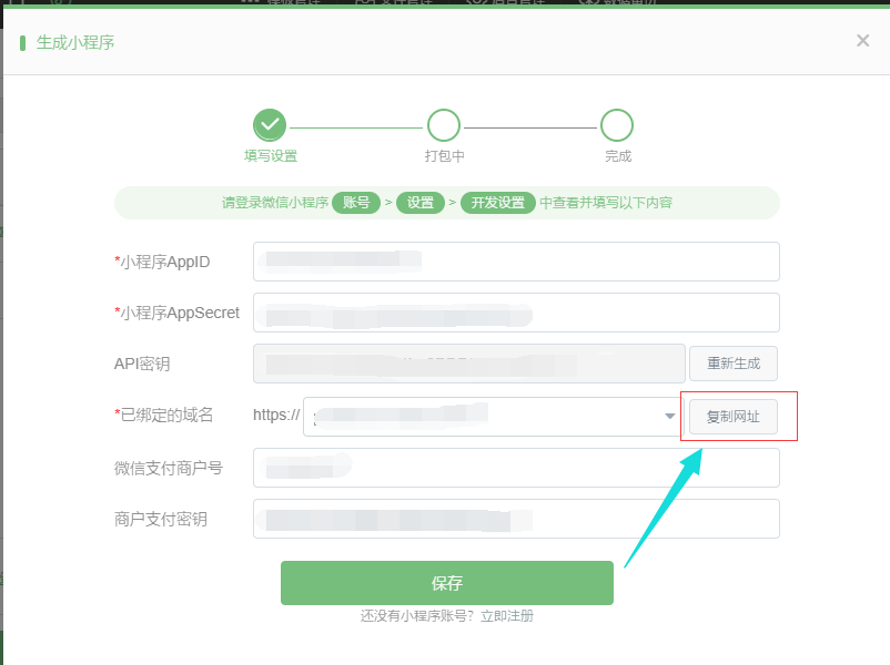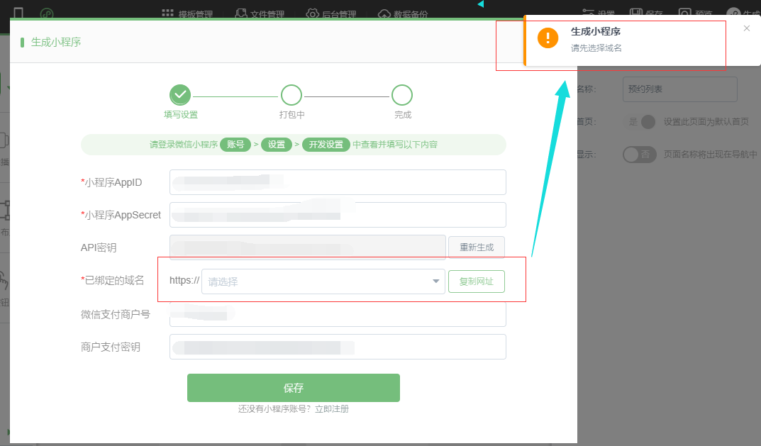 1.小程序编辑器点击生成时,可以直接复制该域名,若没有选择相对域名则会有相应的提示,选择并复制成功后同样会有相应的提示,同时建站后台也做了优化,如图所示: