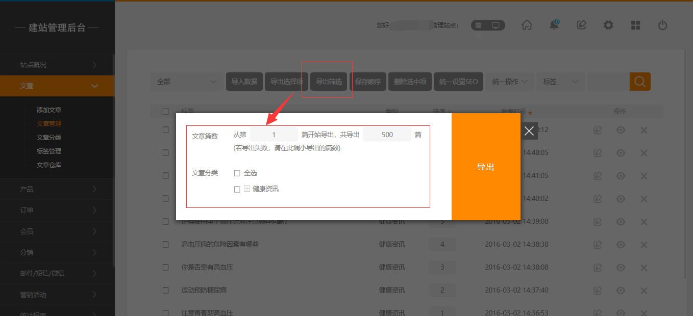 后台-“文章”-“文章管理”,点击“导出筛选”,可以编辑文章篇数以及文章分类,编辑完成点击“导出”即可,如图所示: