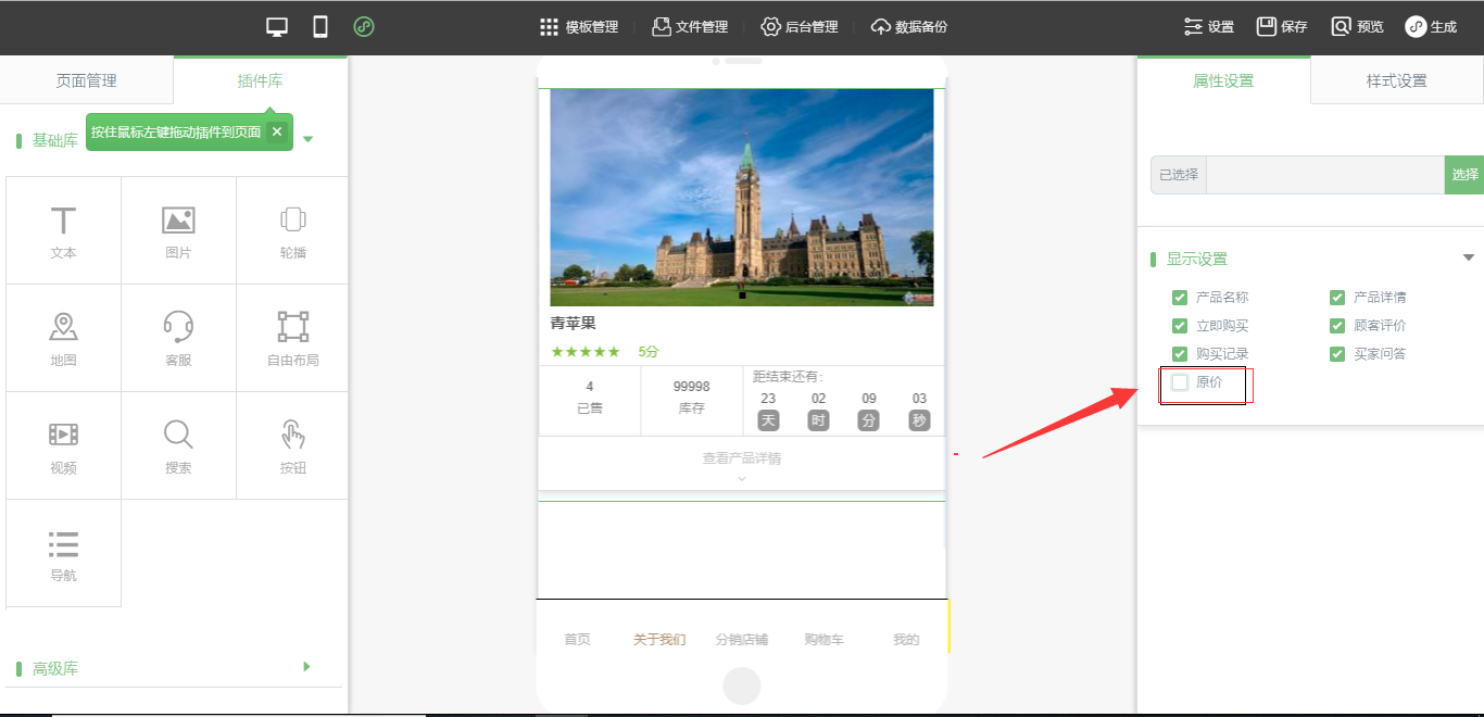 1.在小程序编辑器中,点击“团购”和“”详情插件拖入面板中,在“属性设置”中,将“原价”不勾选即可,如图所示:
