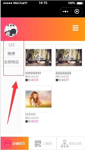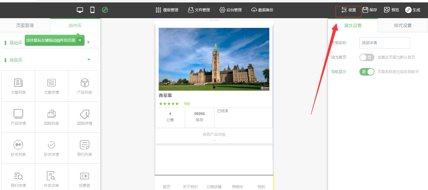 1.在小程序内页中,选择“分销店铺”,在编辑器中,点击“设置”-''内页设置“,可以选择需要展示的分销产品的分类,并点击保存即可: