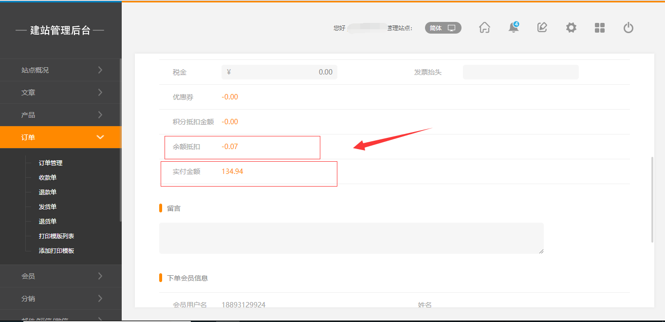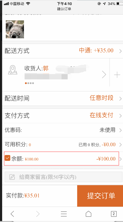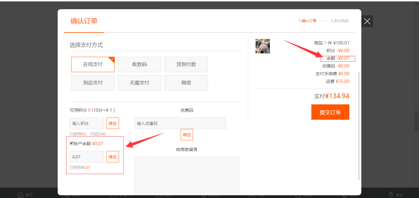 1.以PC端为例,在网页提交订单页面,当余额不为“0”时,会自动勾选余额支付,也可以在输入框中更改余额的数额,如果不需要余额支付,则不勾选即可,如图所示: