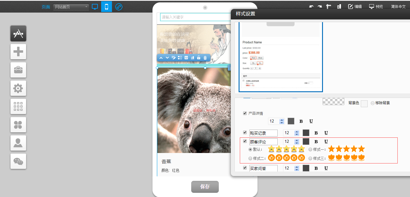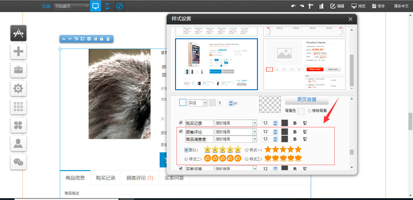 1.以PC版为例,在编辑器中,拖入产品详情插件,点击“样式设置”-“顾客评论”选择样式即可,如图所示: