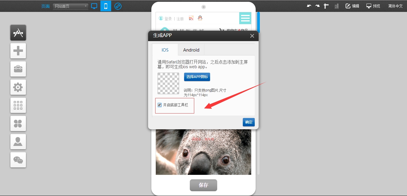 1.在手机版编辑器中,点击“设置”-“生成APP”-“IOS”勾选“开启底部工具栏”即可,如图所示: