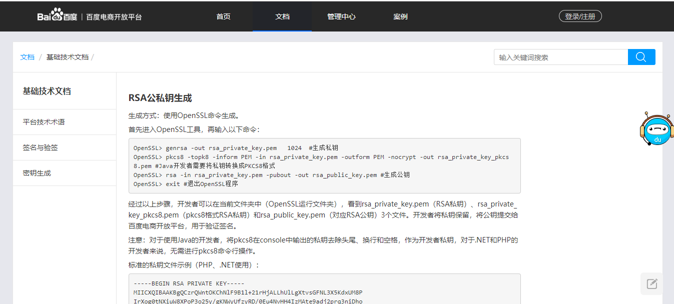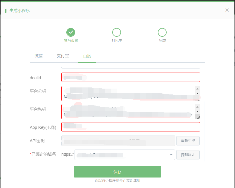 1.登录百度账号,在百度电商开放平台中-管理中心-支付服务设置-我的服务,点击“创建服务”填写相关信息,需要填写的公钥,点击下面的“查看密钥规则”根据说明获取,填写完成即可提交,提交后等待百度审核,点击查看,可以看到整体的信息,其他操作和百度小程序的标准版的操作一致这里不再赘述。