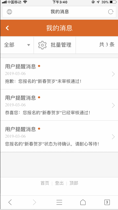 1.在编辑器中,拖入微报名插件,在后台微信管理-微信应用-微报名中添加报名活动,前台用户提交报名表单后,后台的操作在前台会员中心-我的消息中会有消息提醒,如图所示: