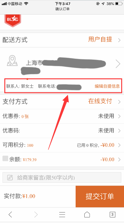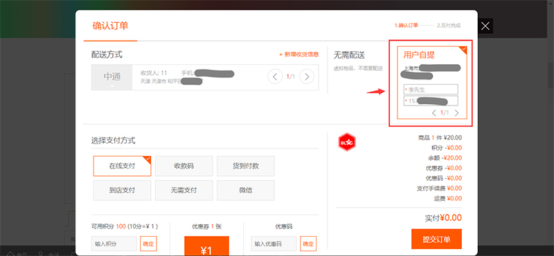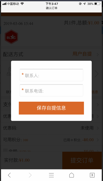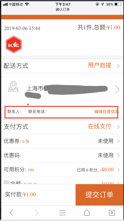 1.以手机版为例,在提交订单时,如果选择的为“用户自提”,需要客户填写相应的联系人与联系电话,在后台订单的编辑中,也会出现该条对应信息,如图所示: