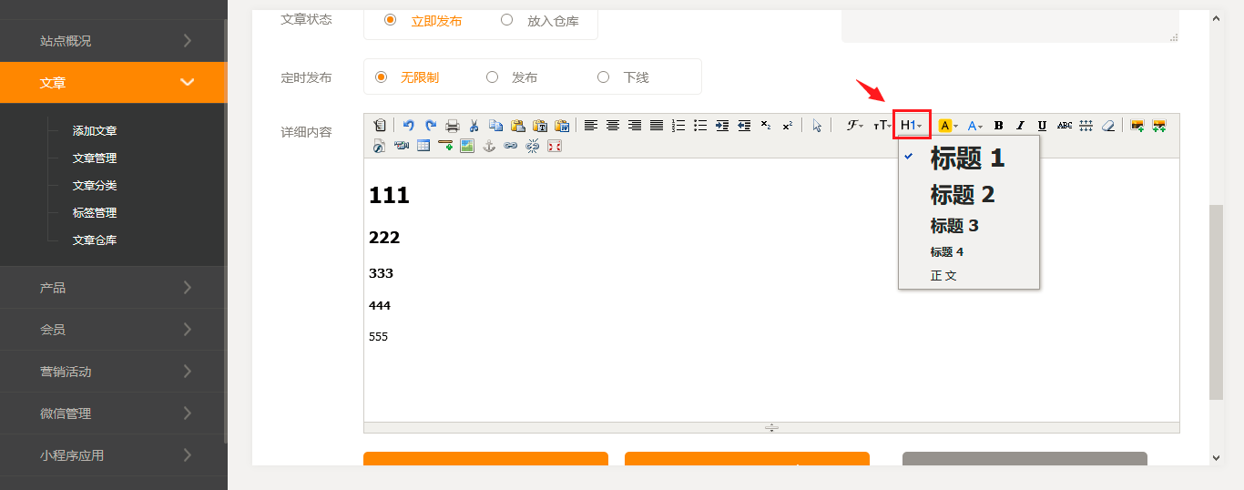 1. 在建站后台,“文章”中修改/新增文章时,在详情的编辑器中,新增了h标签设置项,如图所示: