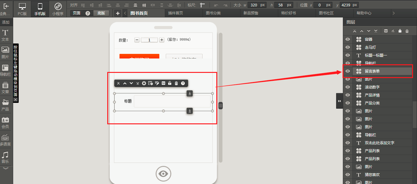 1. 在pc和手机版建站的设计师模式中,现在选择模块的时候,图层里也会跳转到对应的模块了,如图所示:
