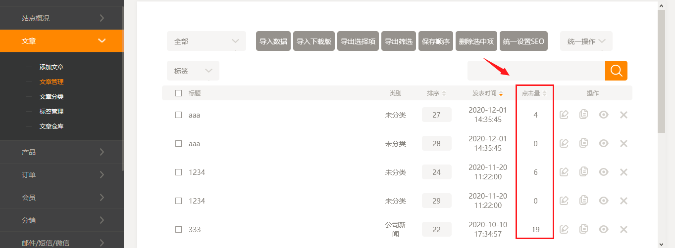1. 在建站后台,“文章”-“文章管理”中,新增了点击量显示,如图所示: