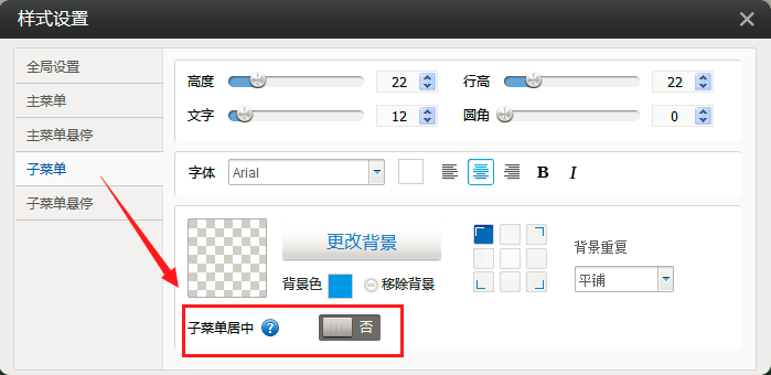 1. 在PC版建站,拖出“导航栏”模块,在样式1、3、4、5的子菜单设置项里,新增了子菜单居中设置项,如图所示: