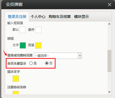 1. 在手机版建站,“设置”-“会员弹窗”-“登录及注册”中,新增了会员头像显示的设置项。关闭后,在登录界面的默认头像将不再显示,如图所示: