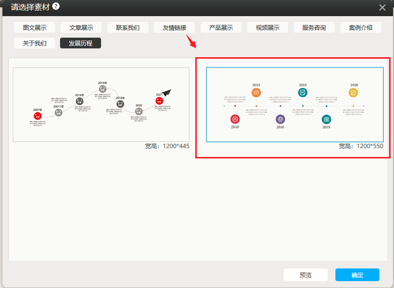 1. 在pc版建站,素材模块“发展历程”中新增了一个样式,如图所示: