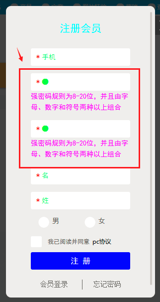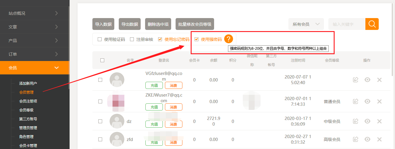 1. 在建站后台,“会员”-“会员管理”中,新增了“使用强密码”的设置项。若启用,则注册、修改密码时,用户的密码必须符合“8-20位,且由字母、数字和符号两种以上组合”这一规则。如图所示: