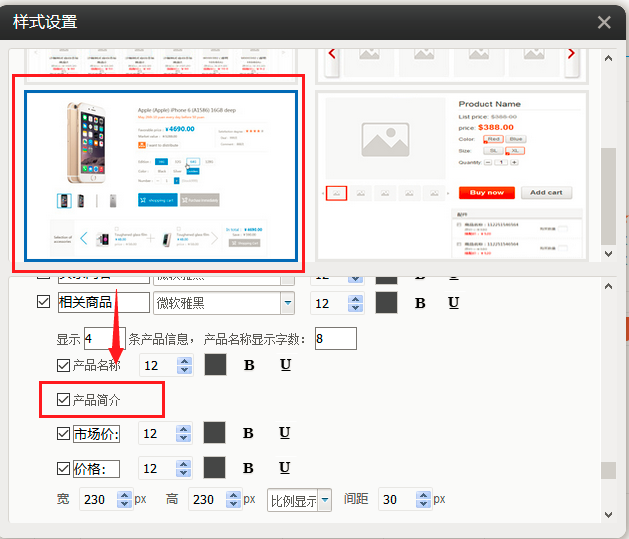 1. 在pc版建站,拖出“产品详情”插件,第三个样式的相关商品中,新增了产品简介的显示控制项。如图所示: