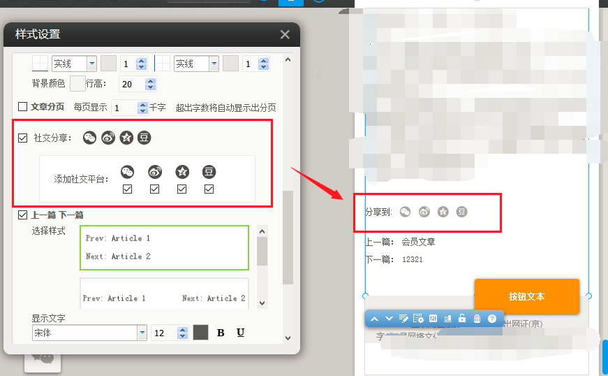 1. 在建站手机版,拖出“文章详情”插件,点击样式设置,新增了社交分享功能,如图所示: