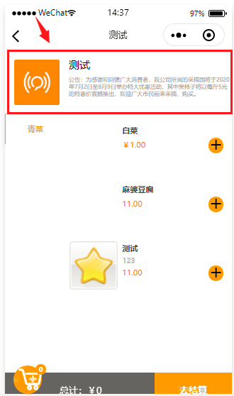 1. 在小程序中,外卖点单的店铺首页新增了店头公告,用于展示店铺头像、名称和公告,如图所示: