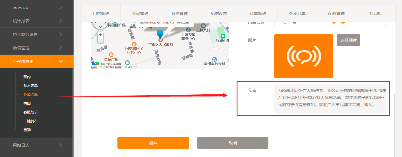 2. 在后台,“小程序应用”-“外卖点单”-“门店管理”中,新增了公告设置项(多80个字符),如图所示: