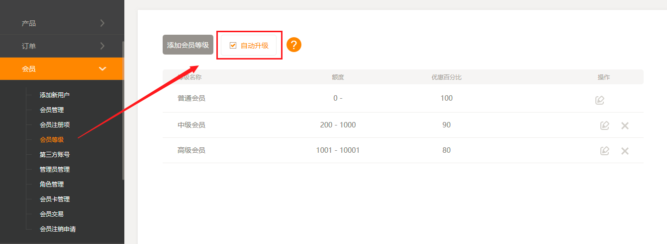 1. 在建站后台,“会员”-“会员等级”中,开启或者关闭自动升级时,日志里会记录下此次操作了,如图所示: